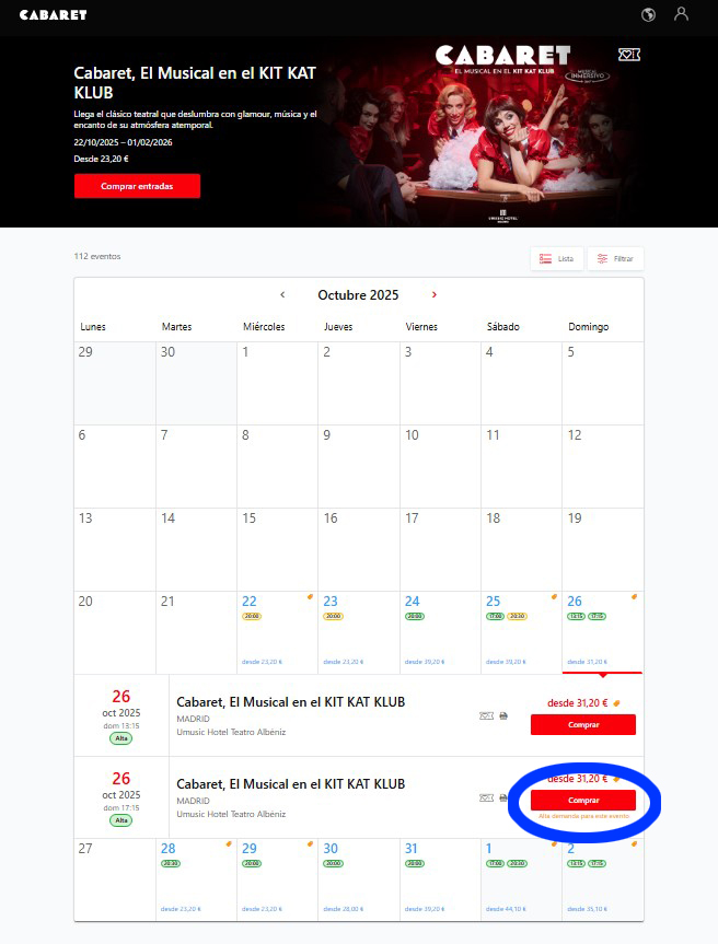 Puedes seleccionar cualquier día que haya representación del espectáculo, excepto los jueves y los sábados en la sesión de las 20h. Las butacas que están disponibles para esta promoción son exclusivamente las que se encuentran en la zona de Club 1ª planta A y B. La fecha límite para canjearlos 30 de noviembre de 2025.