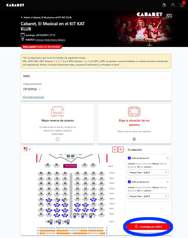 Verás en la parte superior izquierda de la pantalla observarás que aparece un cajetín rotulado en la parte superior con la palabra «TAXIS» donde debes introducir el código que has recibido. A continuación selecciona «elige la situación de tus asientos» y selecciona aquellos que estén exclusivamente en la zona de PATIO DE BUTACAS B Y ANFITEATRO. Si has seguido las indicaciones correctamente hasta aquí, como muestra el ejemplo, en la parte inferior derecha de la pantalla tiene que aparecer que el importe de la compra es 0,00€.