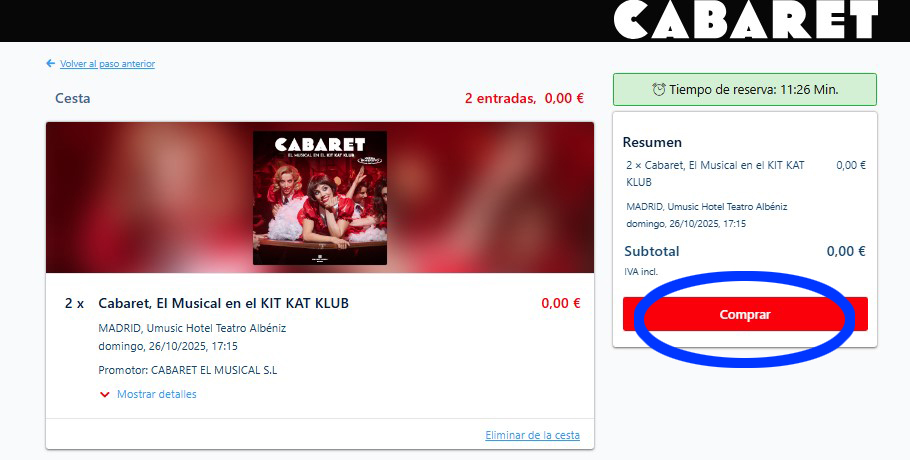 Finalmente verifica que el importe es 0,00€ y pulsa «COMPRAR». En breves instantes recibirás en tu correo electrónico las dos entradas para disfrutar del musical.