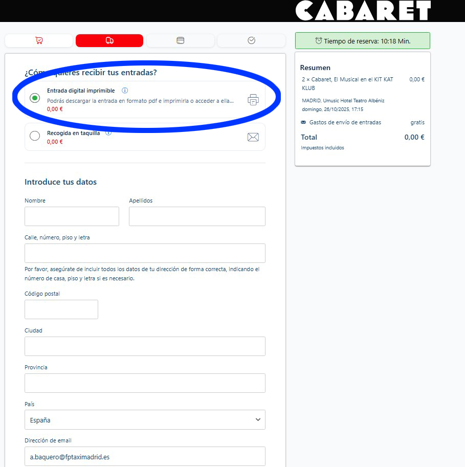 En la siguiente pantalla selecciona «entrada digital imprimible» completa los campos con tus datos personales. Extrema la atención para escribir correctamente tu correo electrónico ya que a continuación en él vas a recibir tus entradas.