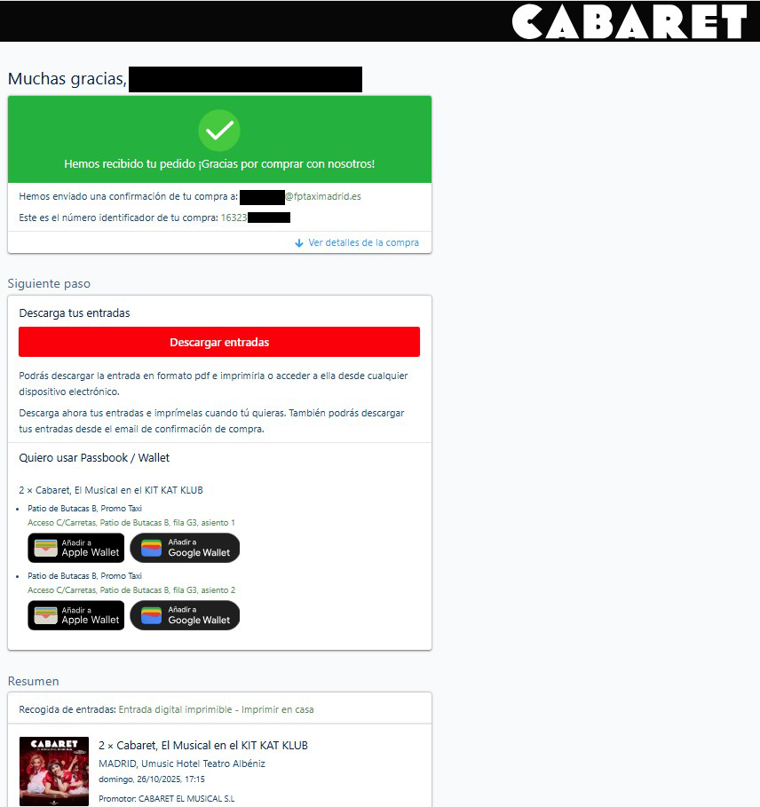 CANJE DEL CÓDIGO RECIBIDO DE «CABARET» POR LAS DOS ENTRADAS