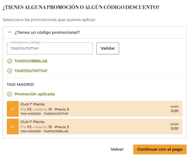 A continuación, debes introducir tu PRIMER CÓDIGO, lo validas y lo aplicas a una de las butacas elegidas. Verás que el importe de esta pasa a ser 0,00€. Sin cambiar de pantalla introduces el SEGUNDO CÓDIGO, lo validas y lo aplicas a la segunda butaca. Veras que el importe total de la compra será 0,00€.
